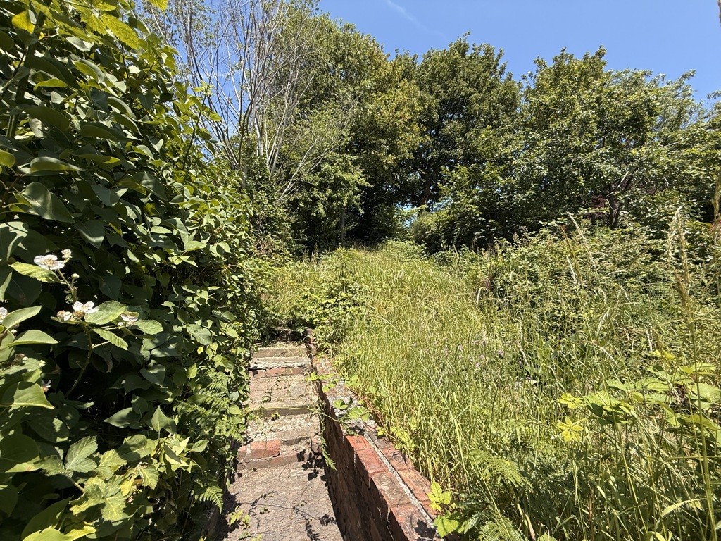 The property occupies a large plot with elevated front garden and long garden area to the rear.